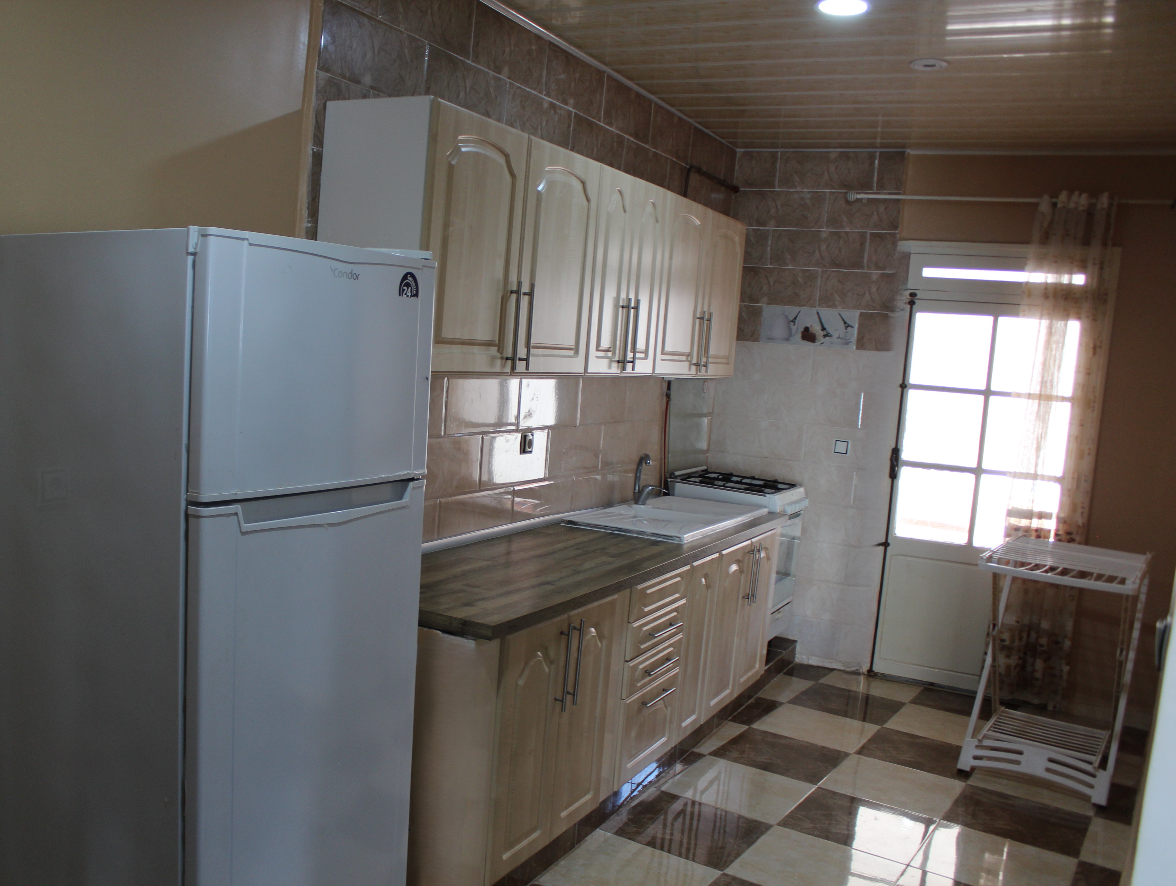 Une Cuisine équipée de Buffet, Réfrégirateur, Cuisinière, Table de Cuisine